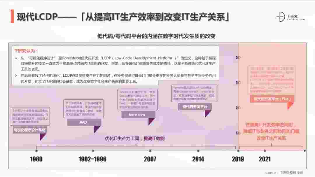 2020年前后,,,,源于提高IT工作者开发效能的LCDP不断进化和衍生,,面对业务导向日益明显的数字化变革。。。。LCDP衍生出了面向不同对象的升级服务——面向专业人群的LCDP和业务人群的NCDP,,LCDP与NCDP的不同服务属性被逐渐认可和接受。。 LCDP在提高IT开发效率的同时,,,,降低IT与业务之间协同的门槛改变IT生产关系。。。
